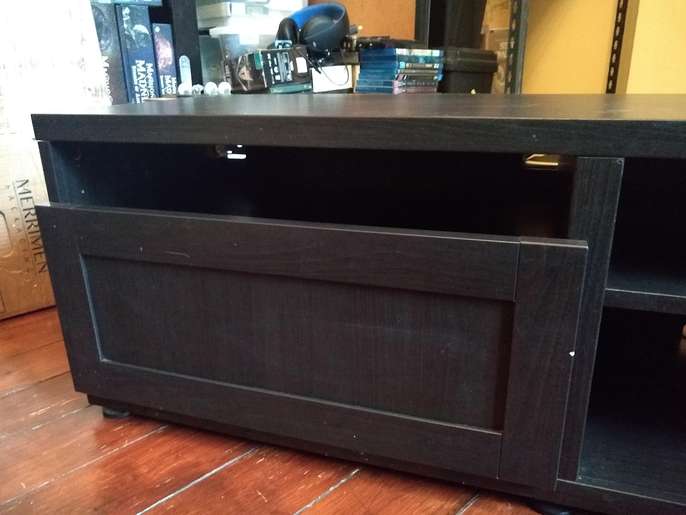 I have a dark brown-black IKEA entertainment stand to give away as we have decided to mount the TV on the wall. It's free to the first person who can pick it up from SW2. It's not heavy, but it is long so you'll need a car that can manage the following dimensions: 1.8m wide, 40cm deep and 40cm high. It has 2 drawers and lots of cavities for cable management. There are a couple of small nicks which are visible in the included pics, but hey, it's free.