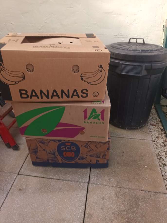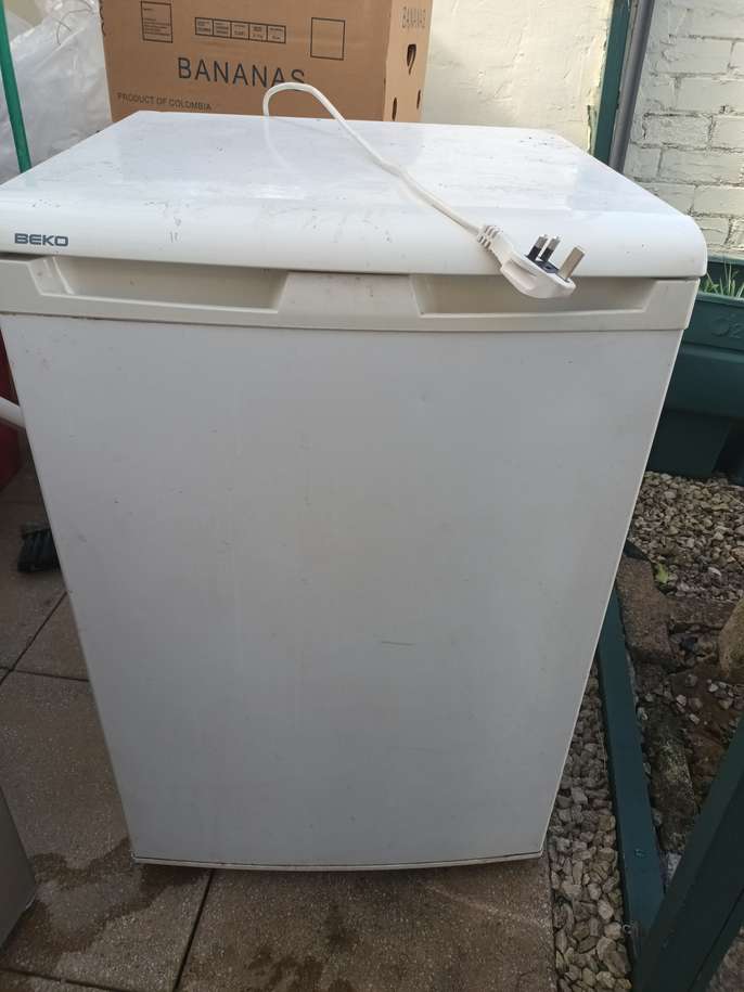 Good working order fridge and freezer. The freezer needs a plug and top drawer holds food,but slightly damaged. Strong Empty Banana boxes.