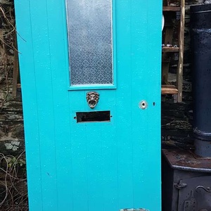 Front door with glazed section , measures 197 cm x 84 cm x 45mm , with cat flap hole , letter box & door knocker attached ..