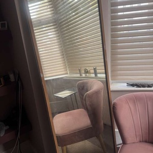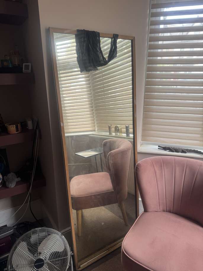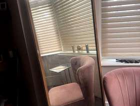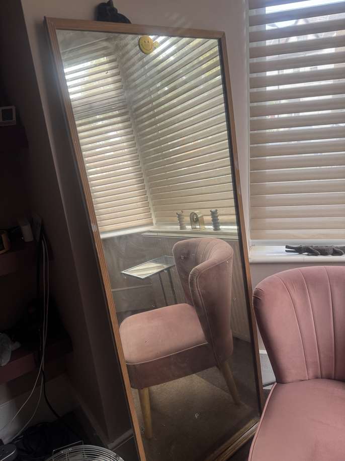 Full size mirror with wooden frame. Quite heavy. Dimensions: 5.5 ft by 2 ft. Has a few paint marks, from when works were being done; just need cleaning.