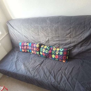 Really comfortable futon that folds out into double bed. Dismantled already so easy to take away. Would need a new mattress but easy to get from ikea. Easy to assemble and can store stuff underneath sofa if needed.