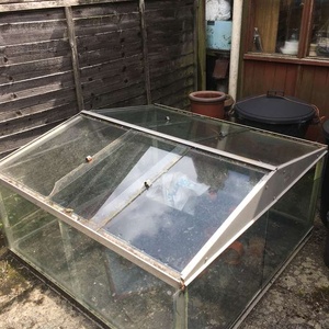 Cold frame for garden. 1.18m x 1.24 x 0.65m approx One pane of glass damaged. To be collected near Winsham. It should come apart but you will need a large car/trailer.