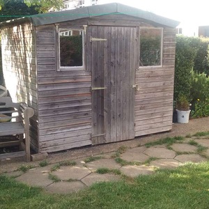 6ft. x 8ft. Door centre front, window each side. Left one opens. Old but new roof last autumn.