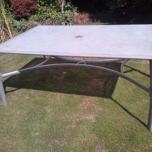 Glass top with grey metal surround. 152 x 96cm. Will dismantle to 'flat pack ' to transport.