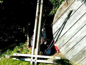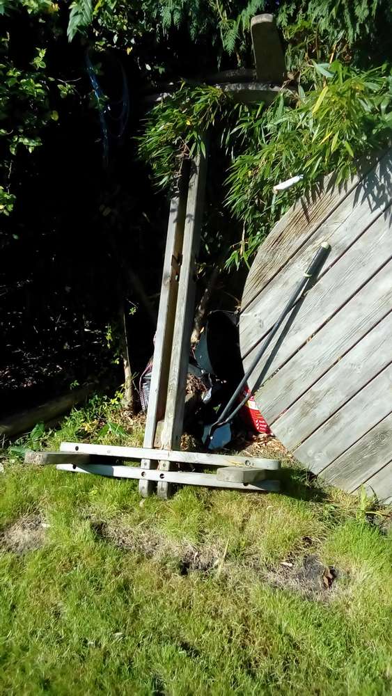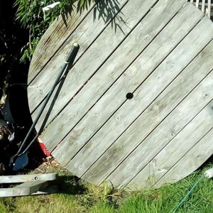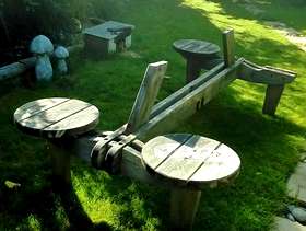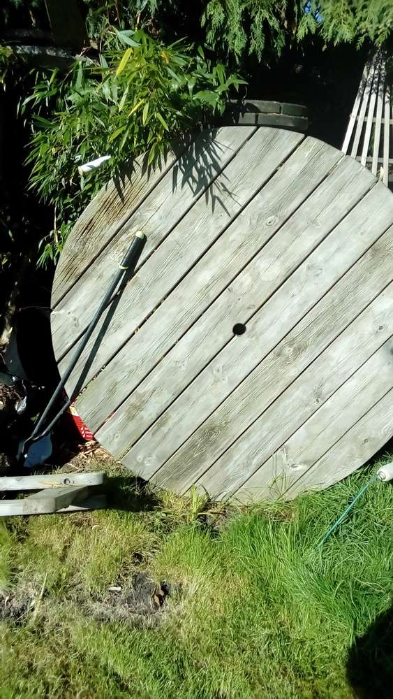 'Alexander Rose' Wooden garden table with 8 integral stools. Table top 147cm diameter, 224cm including stools. Includes bolts for assembly. Very heavy. Has been oiled regularly but will need some tlc before use.
