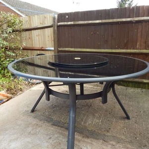 150 cm (5 feet) Diameter black glass top garden table with lazy Susan. In good condition