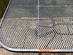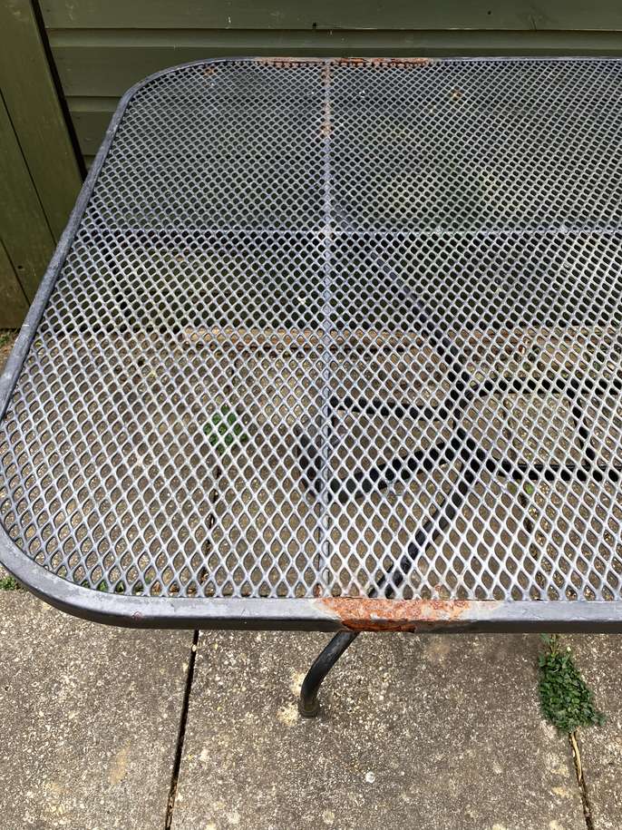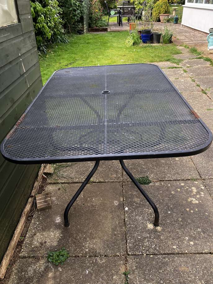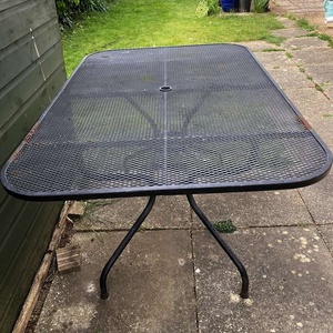 6 seater metal garden table, no chairs. Some rust as can be seen in photo but very solid and stable.
