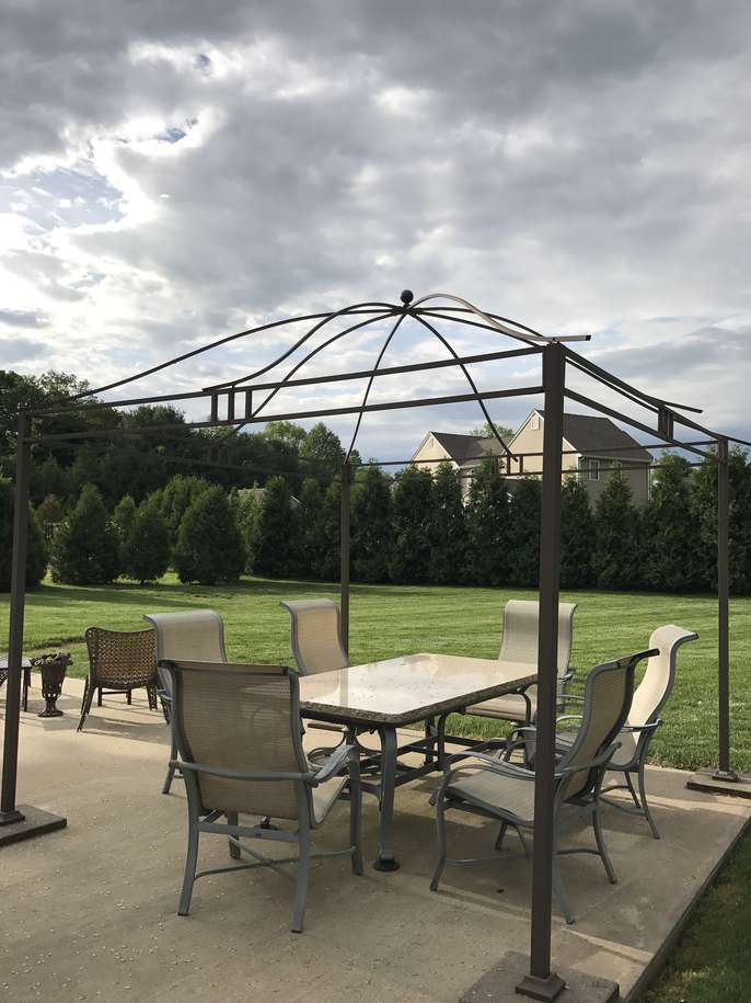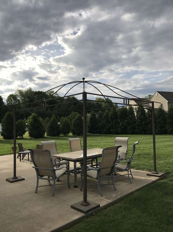 Legacy Gazebo frame for outdoors. We have the catalogue of you'd like to order the canopy that goes with this fame. The dimensions are: 9ft square and 8ft tall in the center