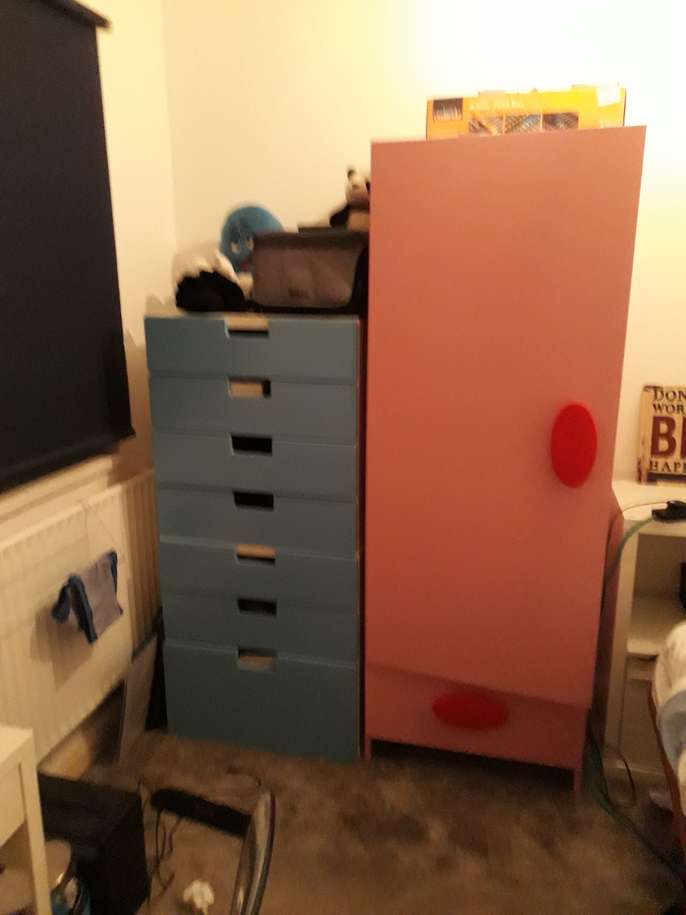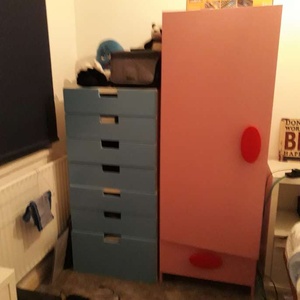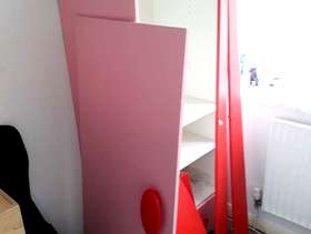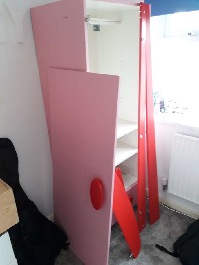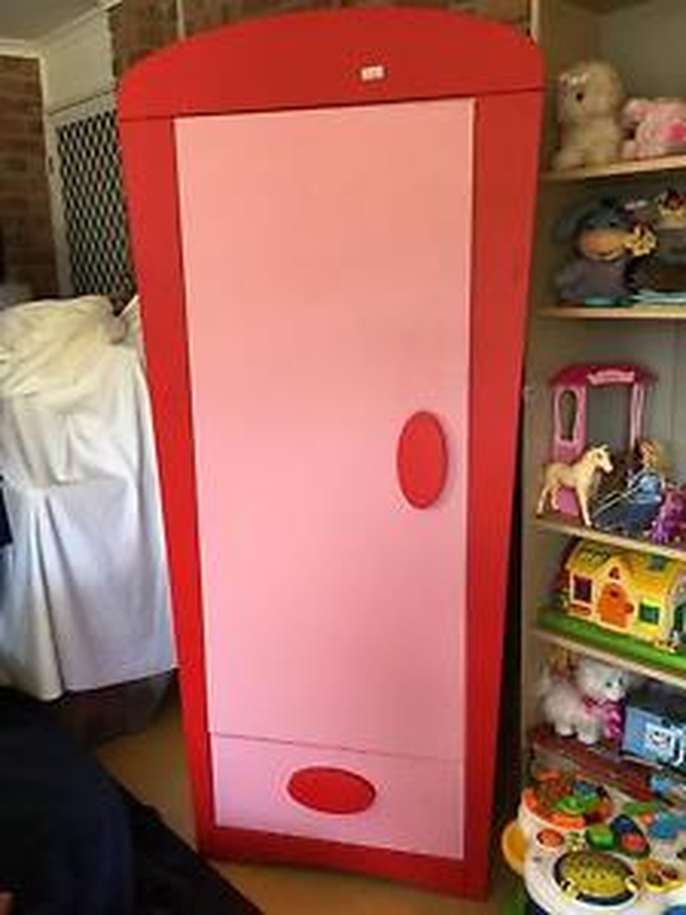 IKEA Mammut Pink/Red Wardrobe. IKEA single wardrobe used but very good and clean condition. Sturdy piece with bottom drawer which glides perfectly. Ideal for little girls bedroom. All in full working order. No longer needed. Can be dismantled for transport if needed and easy to put back together. We have all the side panels and these can be screwed straight back on. It can also be used without them as we have done recently. Pick up or free local delivery to Molesey, Surrey. Was about £140 new Width: 60cm Depth: 50cm Height: 168cm