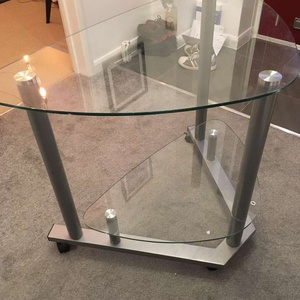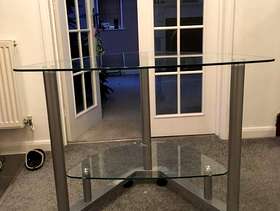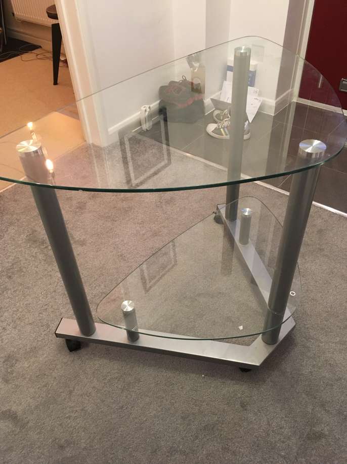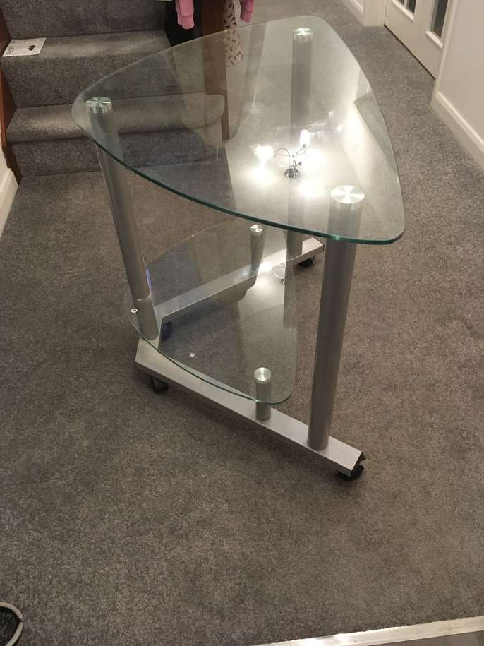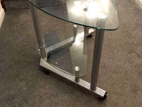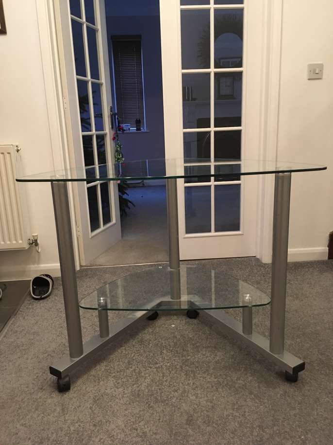 Glass corner computer desk. Has a lower shelf for printer or paper storage. Is on wheels so easy to move around.