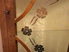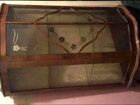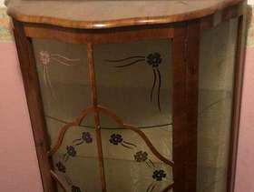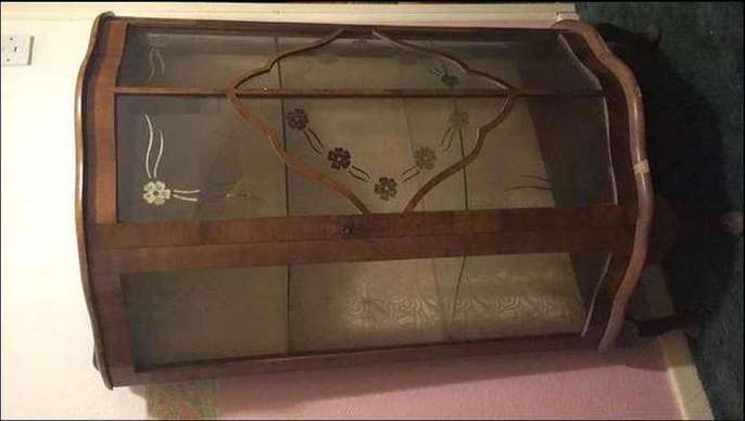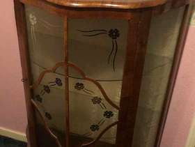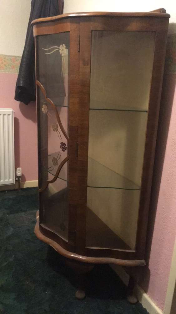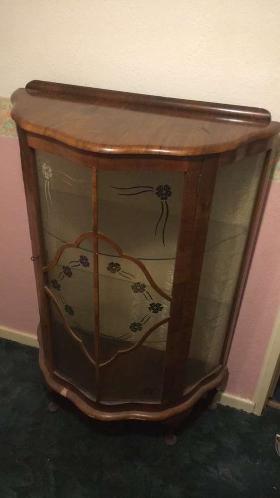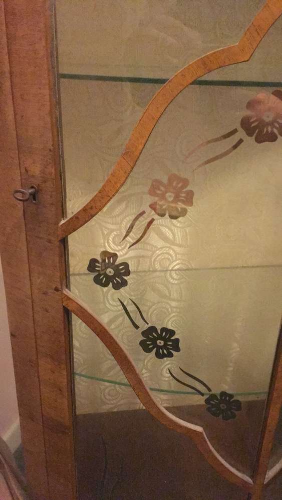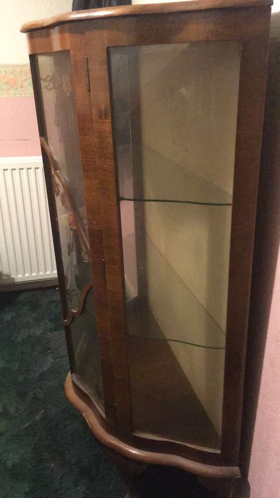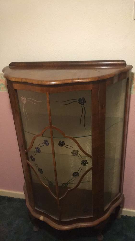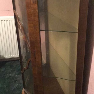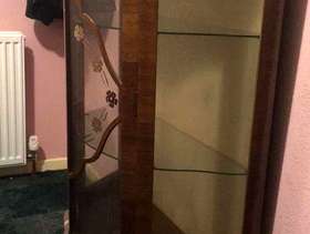 A glass & mahogany wood cabinet with glass shelving and lockable key. 115cm Height x 78cm Width x 36cm Depth In good condition