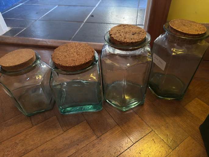 A selection of glass storage jars with cork lids. They have been used for storing food items but are all washed out and clean. There are 12 jars in total and one is missing its lid.