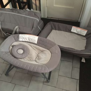 Chicco playard with bassinet and changer. Bassinet and changer have been used and covers washed. Playard itself was never used. Grey and blue with elephant mobile.