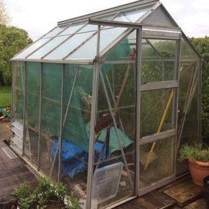 Aluminium framed greenhouse- 8 ft (L) x 6ft (w) x 7 ft (H). All glass present except for 2 panes. Requires dismantling by collector. Aluminium greenhouse bench included for potting. Item no longer required by owner.