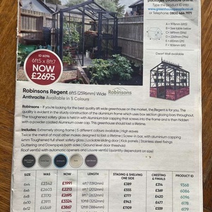 Bought last year , delivered but never erected, packaging deteriorated but in good condition. Robinson Regent 6ft5 wide Greenhouse , colour Anthrocite.