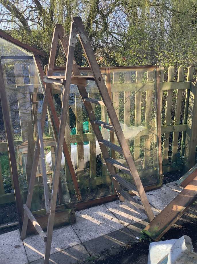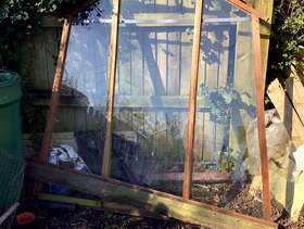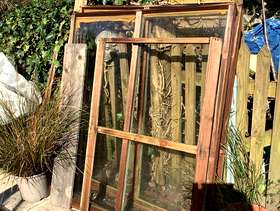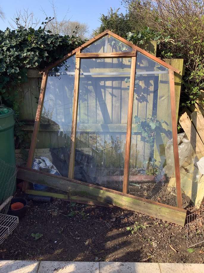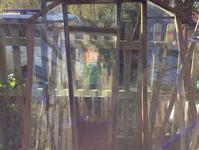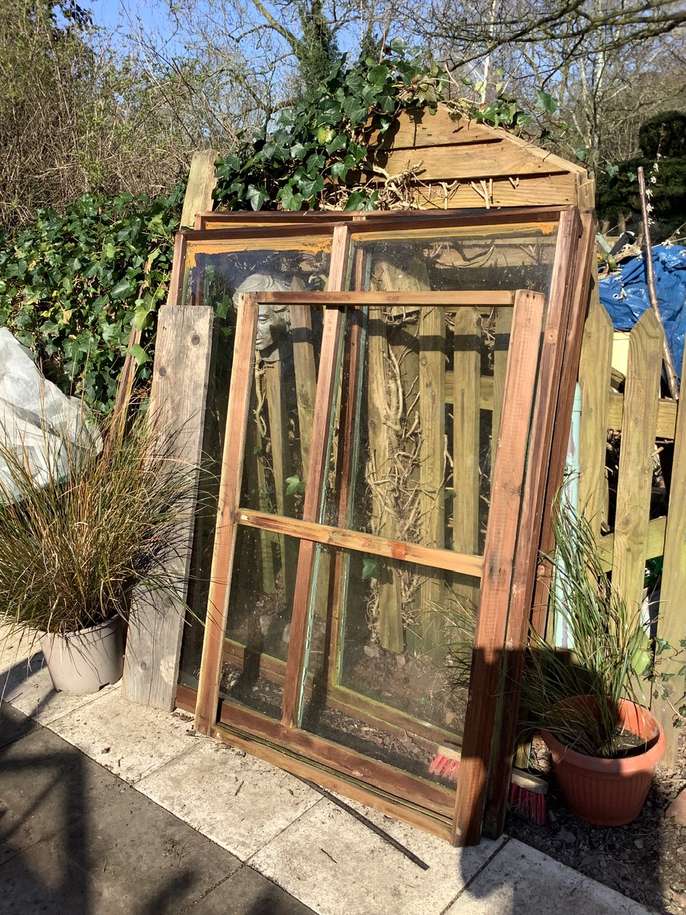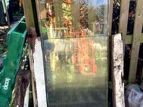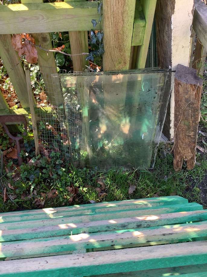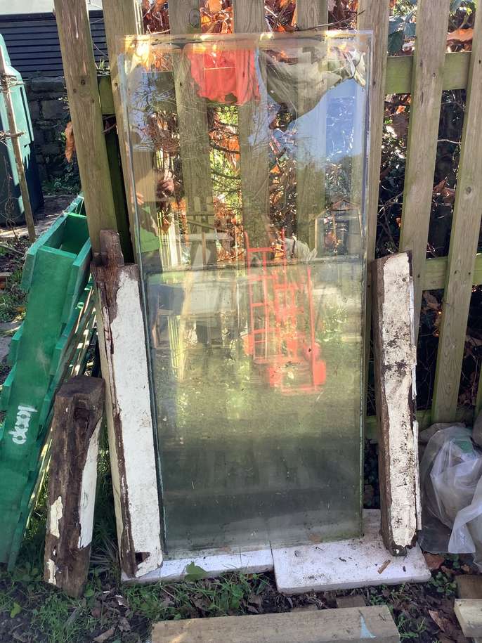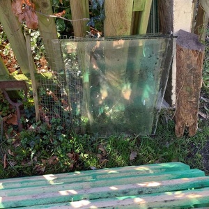 Glass 4mm safety glass from dismantled greenhouse: Separate pieces: 6 pieces 61x85cm 1 pieces 61 x142 2 pieces 61x49 2 pieces 61 x33 In wood ( at the moment, just because it’s safer but can easily be taken out): 8 pieces 61 x 142cm 4 x irregular shapes x142cm and smaller assorted pieces such as triangles There are a few pieces of the surrounding cedar wood parts too but not enough to remake the greenhouse completely.