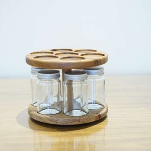 Wooden spice rack. Conveniently rotates. Comes with jars to fill one whole level.