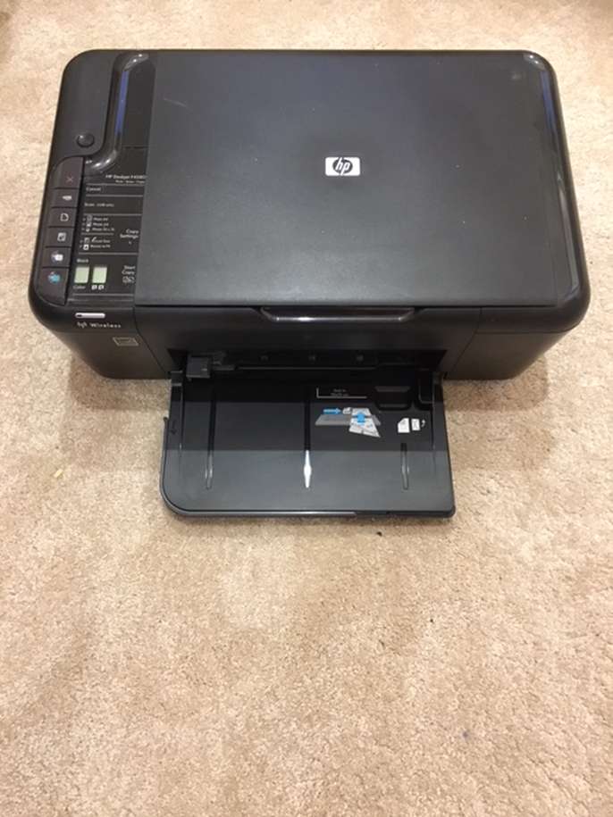 Product Information The HP Deskjet F4580 is a wireless printer, ideal for home and small office. This printer provides one touch wireless set-up through the Wireless Protected Set-up, which enables easy printer management. The dual drop weight technology of this HP All-In-One printer creates greater ink coverage for refined picture quality and reduces the appearance of ink droplets. The HP Inkjet printer offers speedy performance with 28ppm black, 22ppm color print speeds. The HP Smart Web Printing Software of the HP Deskjet F4580 printer enables printing from the Microsoft Internet Explorer, giving you the freedom to select data from web pages. The HP Photo Print Gadget feature of this HP All-In-One printer produces outstanding print-outs of your pictures. The intuitive control panel of this HP Inkjet printer provides easy maneuvering. Prints, scans and copies. Complete with power and USB lead. Ink cartridges are not included. Collection only.