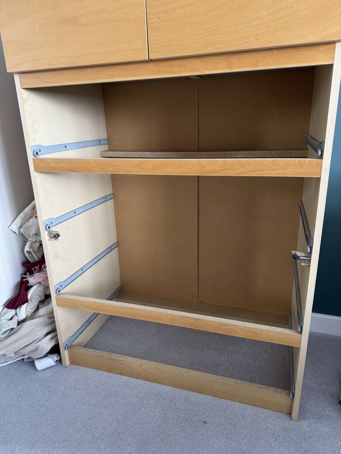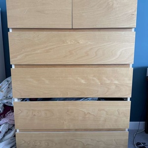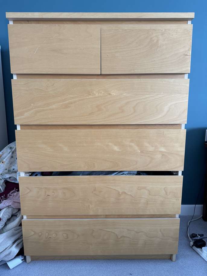 IKEA MALM 6 drawer unit. We’ve had it for some time and one cross strut is broken (see photo). But it’s a sturdy unit with lots of storage. 80x123 cm