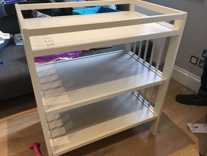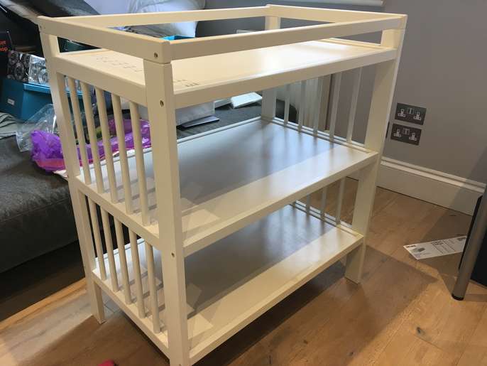 White 53cm width, 82cm length, 94cm total height. Baby changing platform at 84cm high. 2 shelves below changing table for storage