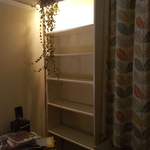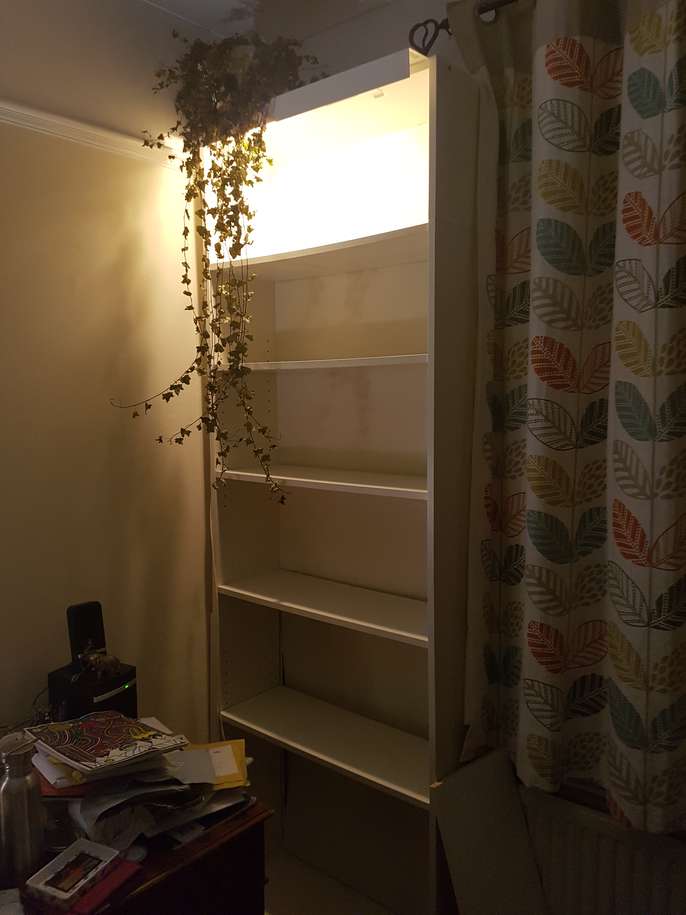 Tall white Ikea Billy bookcase with built in lighting. Some signs of wear , and a hole has ben cut at the bottom for cables. but perfectly sturdy and usable. This hole is covered once items are on the bottom shelf. MUST be collected on Thursday 29 March.