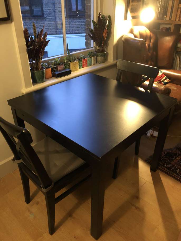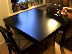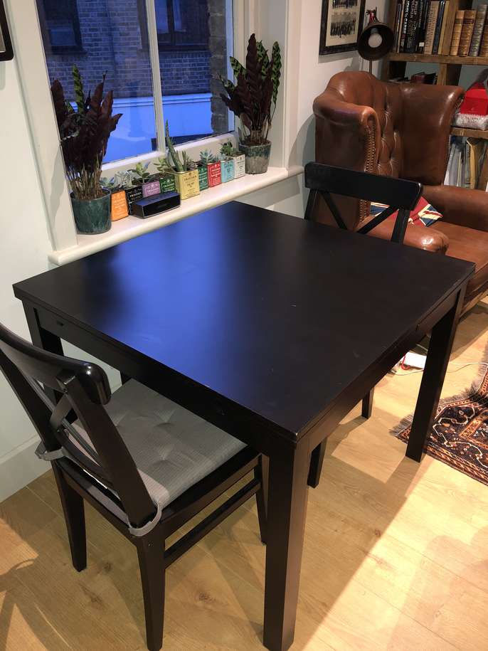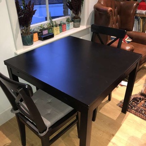 Square extendable black Ikea bjursta 4 seater table, extendable up to 8. Plus two matching ikea chairs. Good condition, a few light scratches on the table top. Chairs are in perfect condition and include detachable cushions. Measurements: 90cm by 90cm square, 129cm with one leaf out, 168cm with both leaves out. 75cm high.