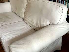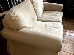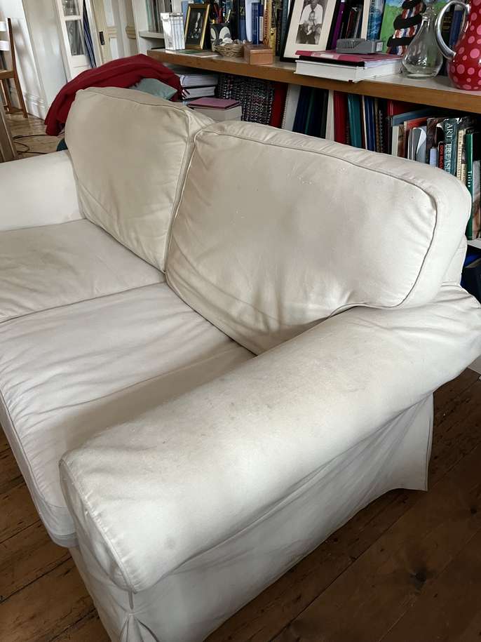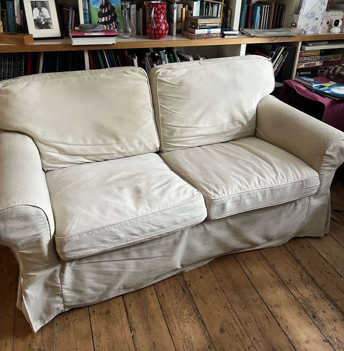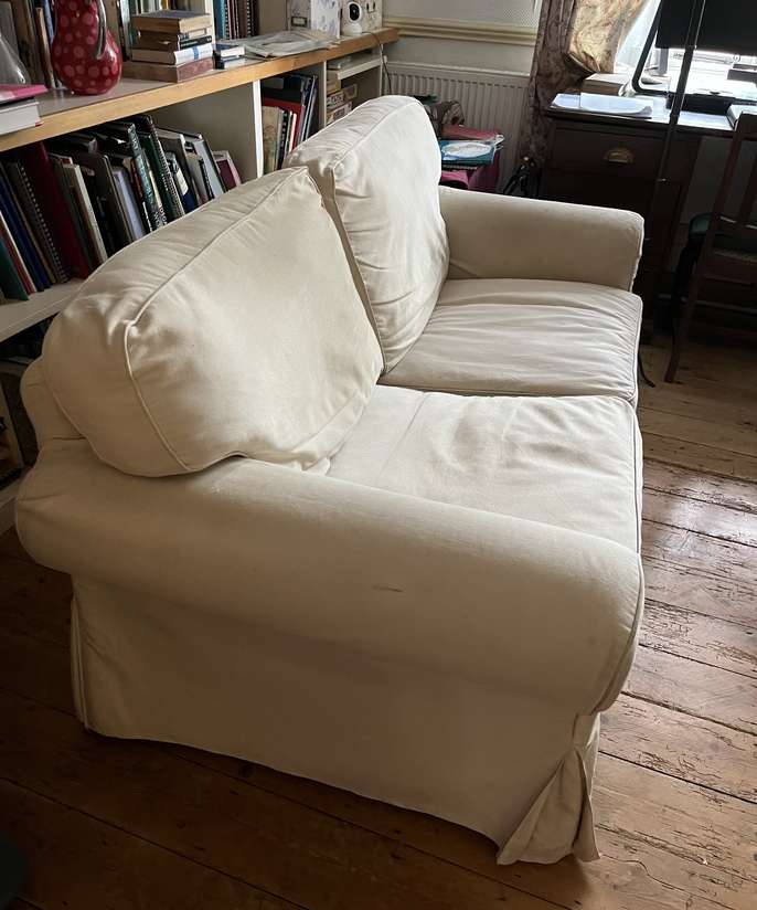 Sound but used sofa. Smoke-free home. Dimensions seat width 128cm, widest point 174cm, height of back frame 74cm. Buyer to collect.