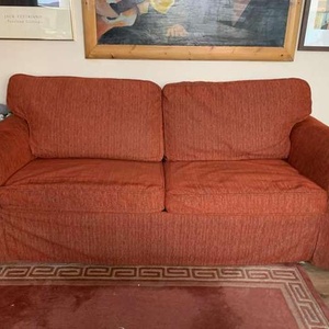 Ikea Ektorp three seater sofa bed.Bed has barely been used .All mechanisms working perfectly.Burnt orange cover made by Dekoria(they make covers for all Ikea sofas)Mattress has washable cover. Very heavy will need two strong people and a van. Width 200 Depth 90 Less