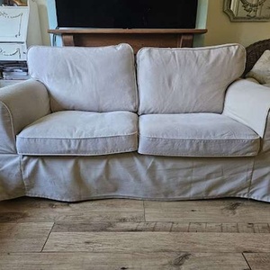 IKEA cream Ektorp sofa, secondhand Width 178cm Depth 83cm Height 80cm Must be picked up, you must have your own transport. I'll give you a hand getting it out. First come, first served. Preloved, with some cat art on the arm - but still with a lot of life left. Back and seat cushions fully laundered Kingston Vale