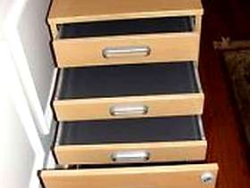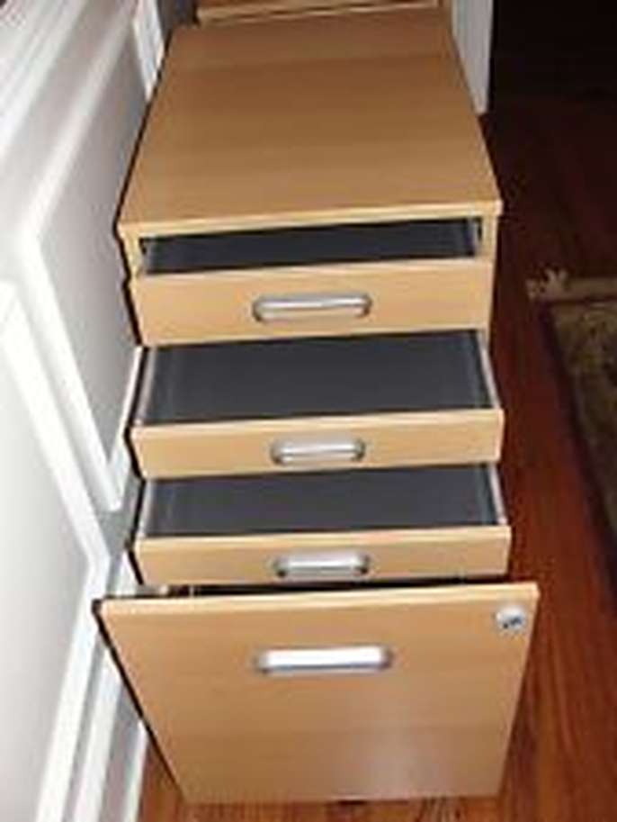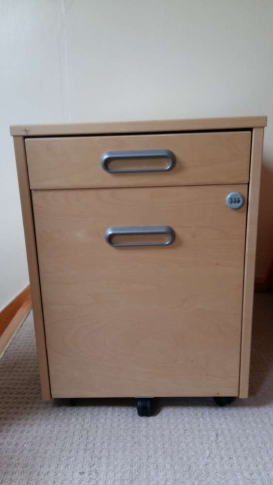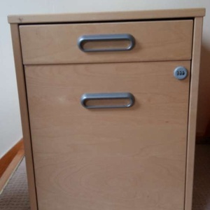 An IKEA Galant File Cabinet. The dimensions are: 18" Wide X 24" Deep X 24" Height. It has two hidden drawers and two visible drawers. It has a combination lock for security. It is on rolling wheels although unfortunately one wheel is broken.