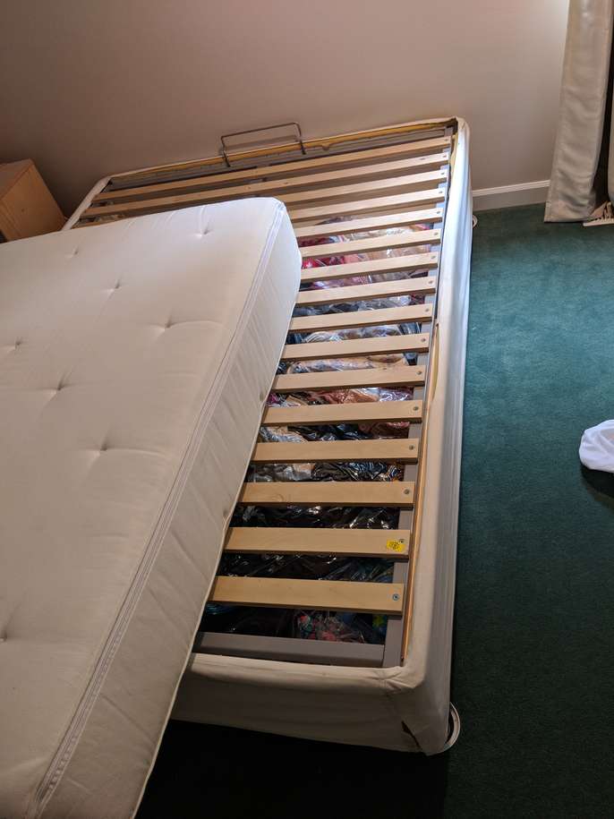 Similar to https://www.ikea.com/us/en/catalog/products/40249881/ . Used Queen bed with lifting storage area and mattress. Still in good shape, was used as a guest bed until we lost a guest room and needed to give this thing the boot. Hope it finds a new hope.