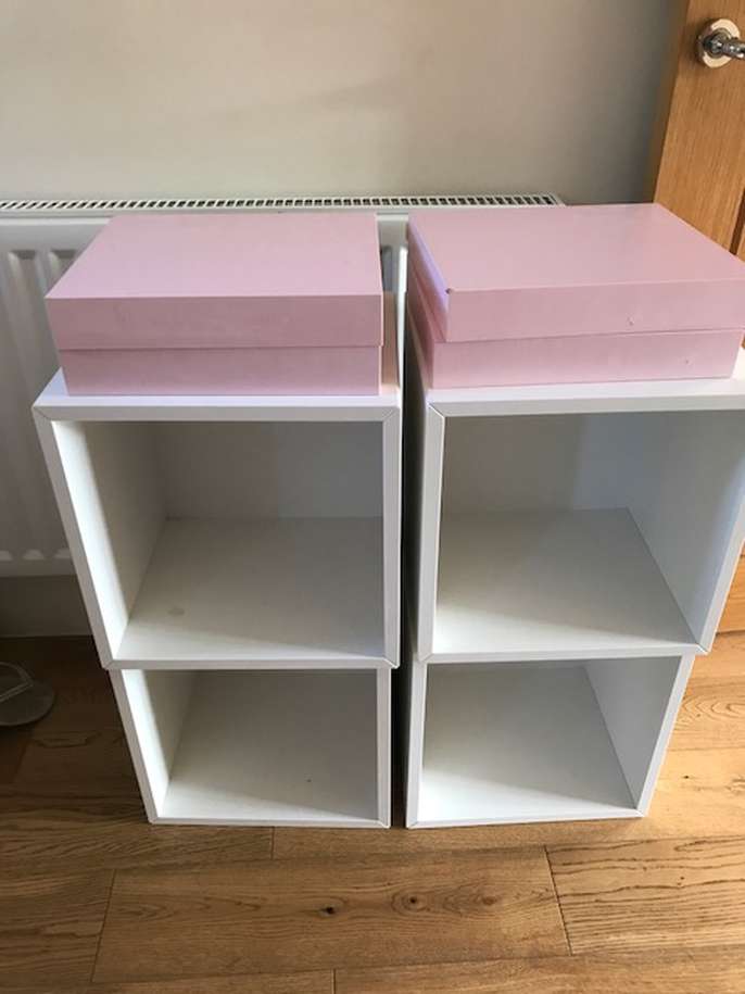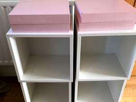 I have 4 white box shelves from Ikea, and also 4 pink Ikea thick shelves (with most of the fixtures). If someone would like to collect them asap, that would be great.