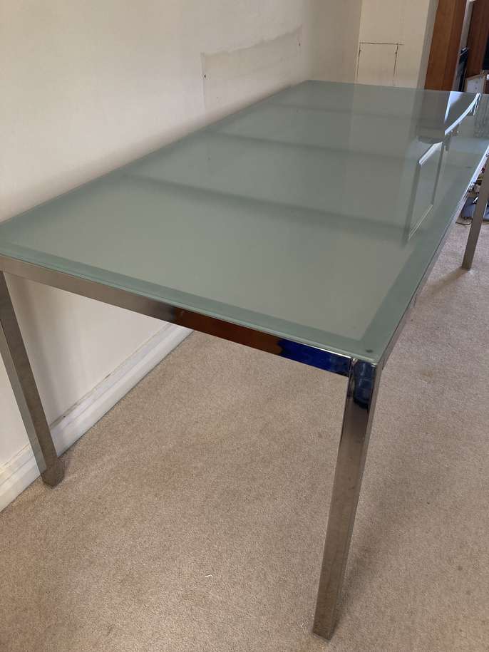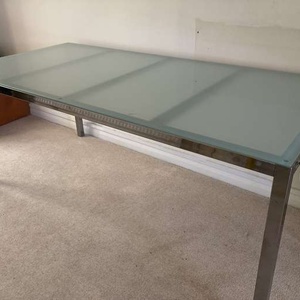 IKEA Torsby dining table with Chrome legs This item is in Chandler's Ford GB All the details Frosted glass top with chrome metal legs. Seats 6-8, Category Furniture Request This Item Ask a Question Post Message