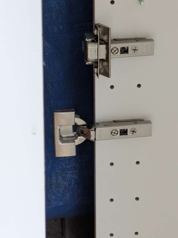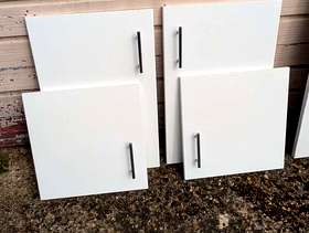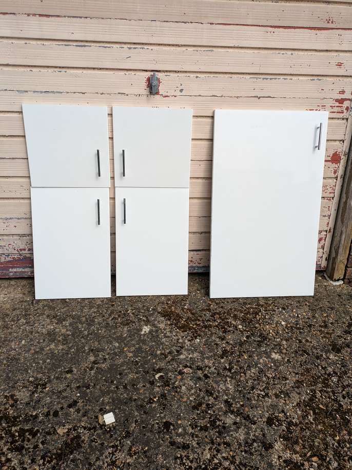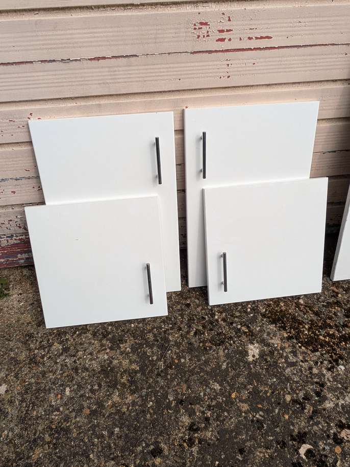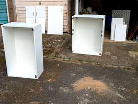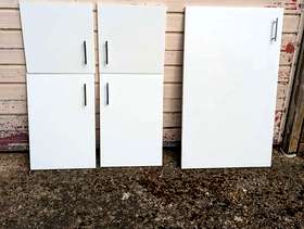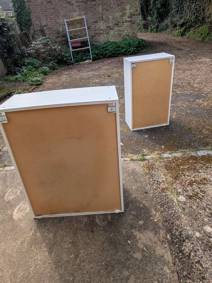 Two IKEA wall units. White. First: 100cms tall, 80cms wide, 36cms deep. 4 high gloss doors with handles. 2 shelves. Quick release hinges (no drilling). Slight bowing to top, otherwise in good condition. Second: 100cms tall, 60cms wide, 36cms deep. Same spec as larger one but only one door, better condition