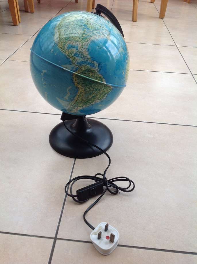 Illuminated globe - light inside. Globe about 250mm diameter. Excellent condition. It's at least 25 years old so a few countries have new names! But great for seeing the relationship between continents etc. It's yours if you can collect it