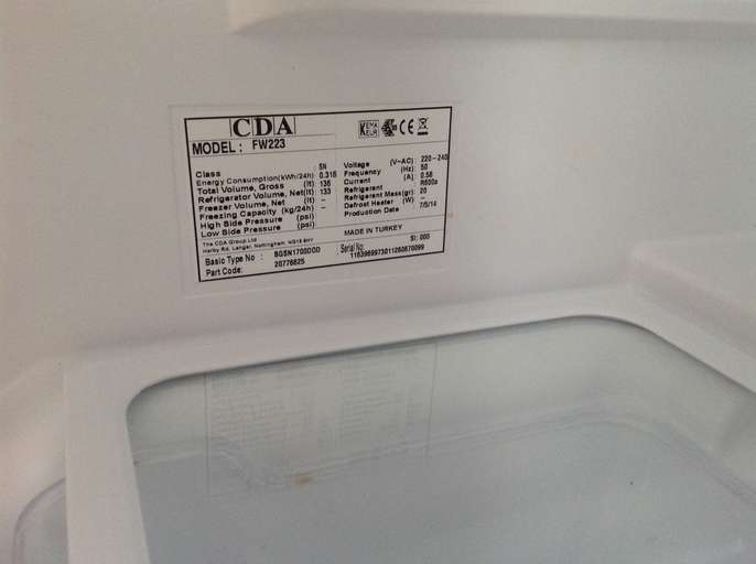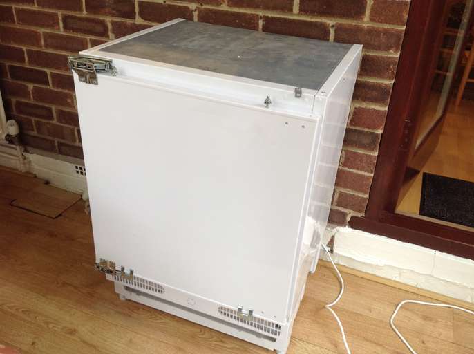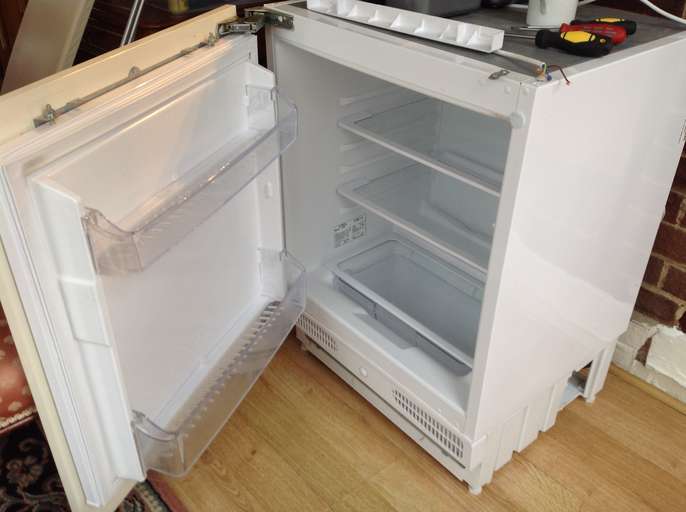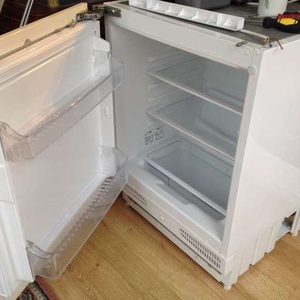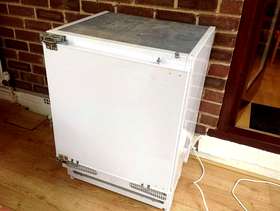 White integrated fridge, about three years old. In good working order. Dimensions - 83cm high, 59.5 cm wide, 55 cm deep. Disconnected and ready to be collected.