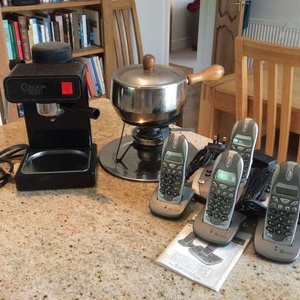 Southwestern Bell 4 hand piece and answer phone home telephone system. Instruction manual included. Works OK, perhaps a little tired. Cordon Bleu Espresso-Cappuccino Maker. Fondue Kettle -stand-and burner. We are having a clear out. Recipient takes all.