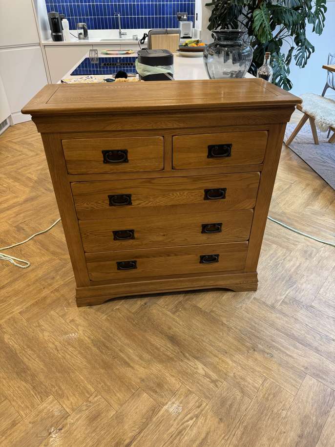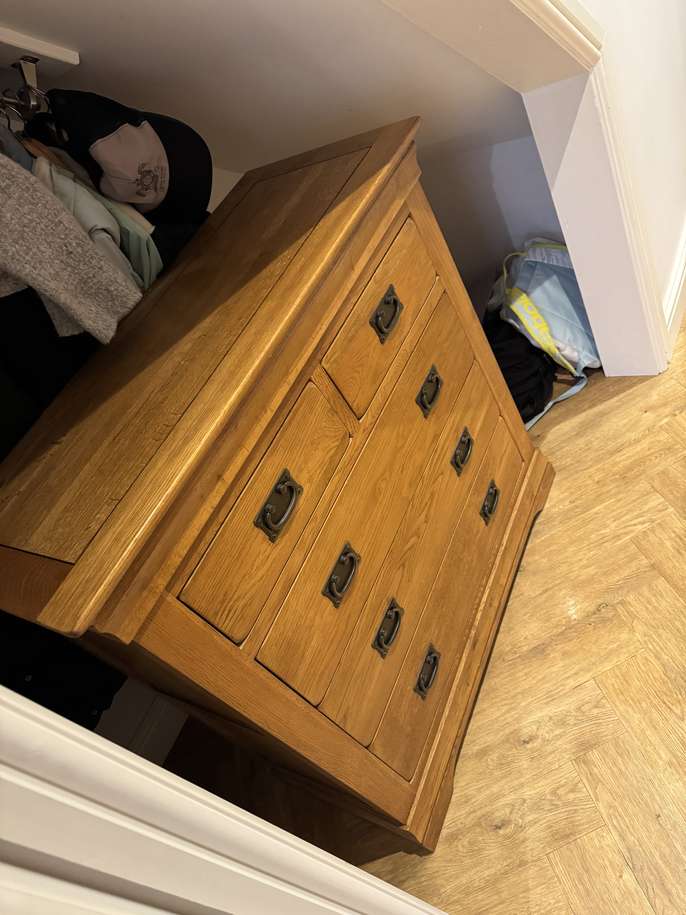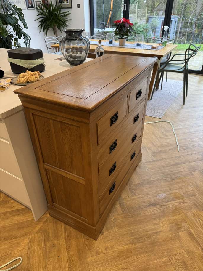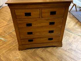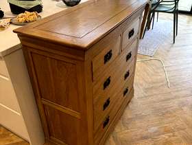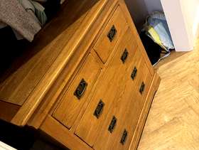 Oak furntiture land solid wood furniture. Used and owned for a number of years, but in good condition. Bed - 164cm W, 215cm L Chest of drawers (Pair) - 98cm W, 43cm D, 98cm H.
