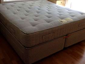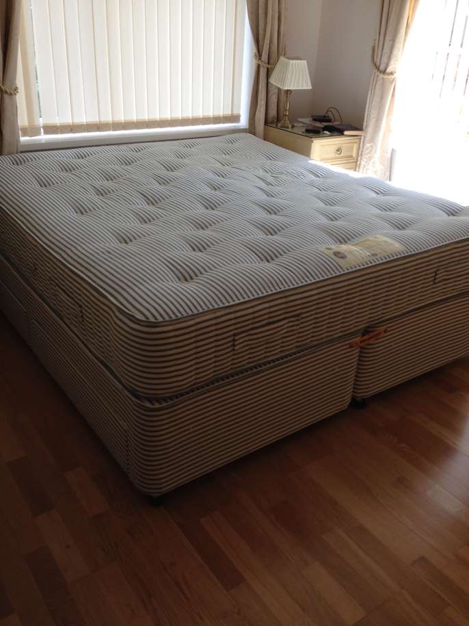 Base splits into two for easy removal. 2 drawers in each base. Mattress clean. Very comfortable. 200cm long x 180cm wide. To be collected Friday 25th or Saturday 26th August. Not possible after this date. Bring strong person to lift it downstairs and big enough transport.