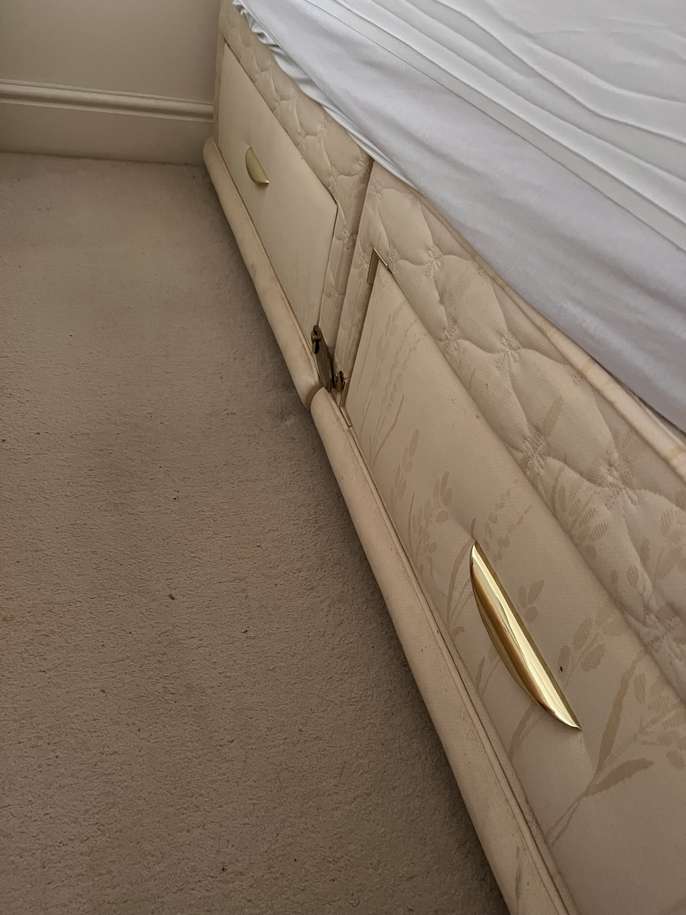 King size divan base (has two halfs so could be used as 2 single beds) Two large draws on both sides so easily fits in bedding, duvets, pillows or whatever! Very good quality.