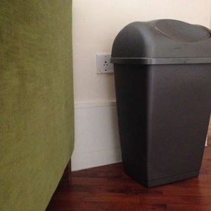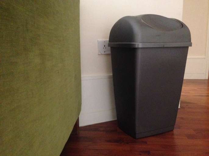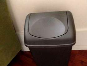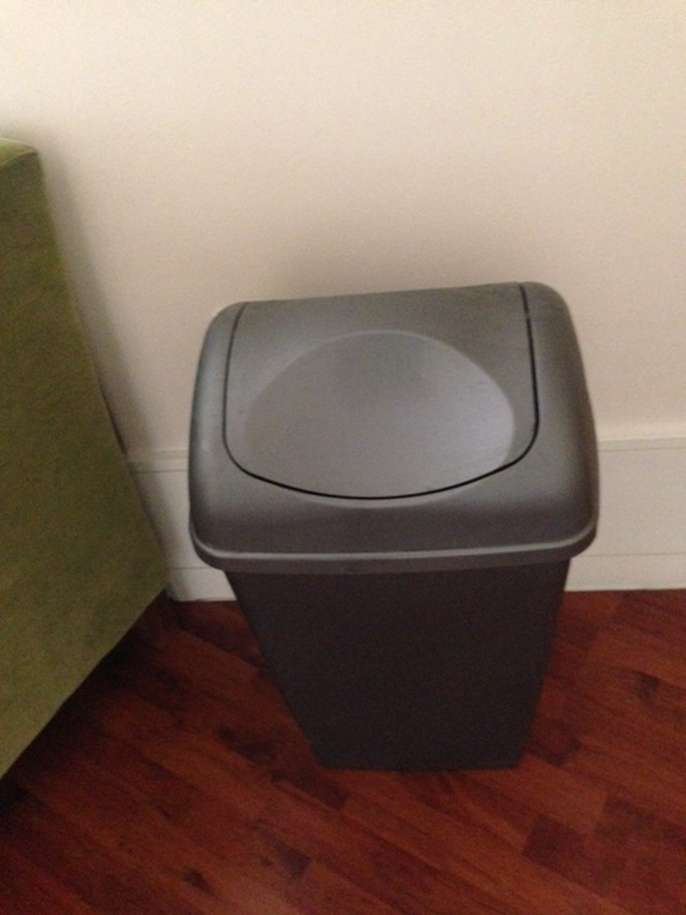 Basic silver grey plastic kitchen bin with flip lid. Works fine but longer needed. Dimensions 65cm x 30 cm x 36 cm.
