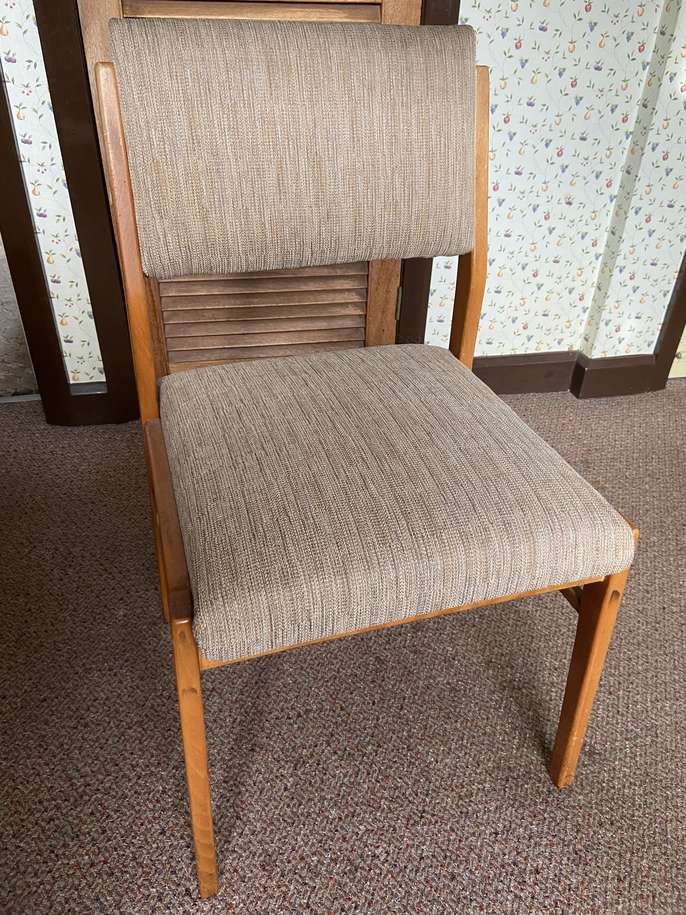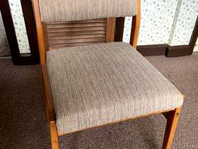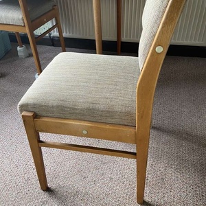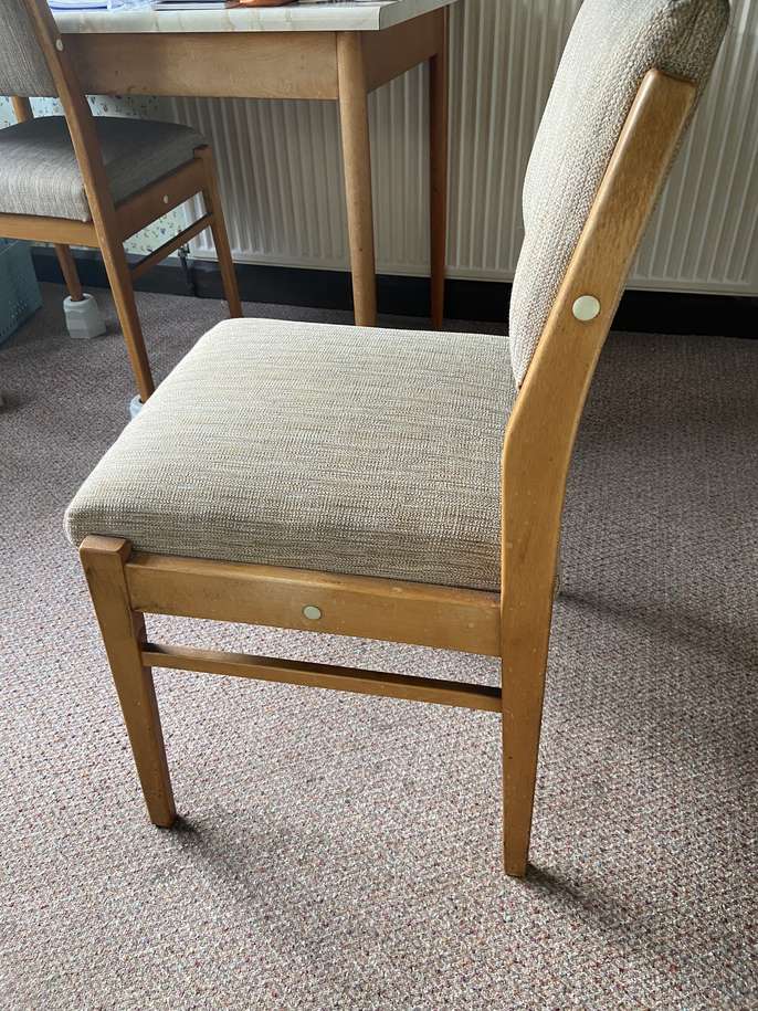 Sturdy wooden kitchen chairs, upholstered back and seat - ideal for upcycling. To be collected