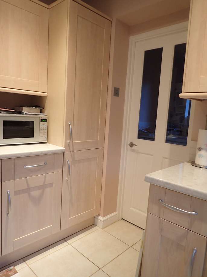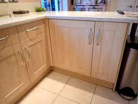 Howdens maple shaker kitchen units 3 x 500mm tall larder cupboards, 1 x 800mm base, 1 x 1000mm base, 2 x 600mm sink base, 1 x 300mm base, 1 x 600mm narrow base, 1 x 300mm narrow base, 1 x 500mm top cupboard, 1 x 300mm top, and 1 x 600mm corner top cupboard. The tops and sinks are also available.