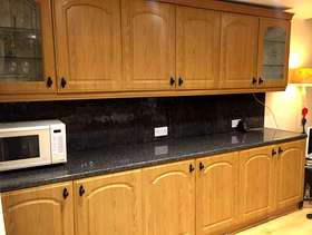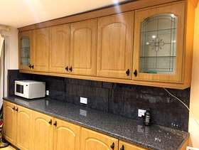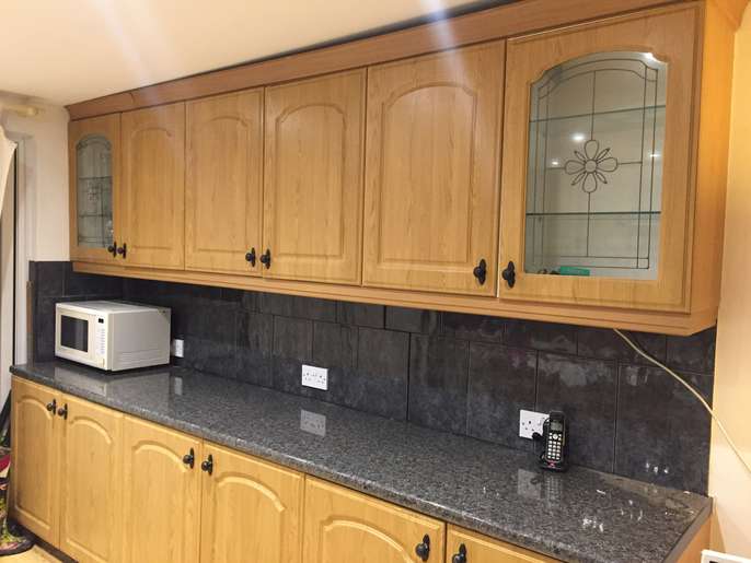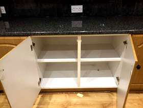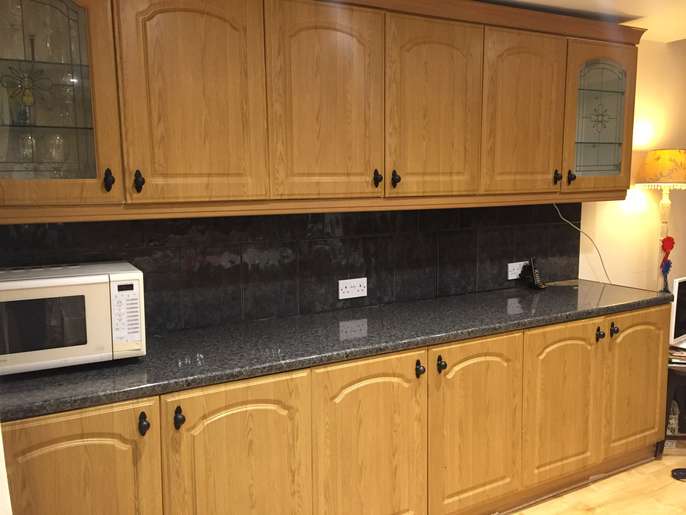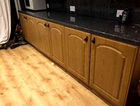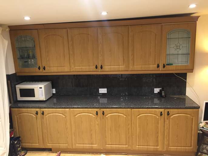 Three double base units, granite effect work top, two glass door wall units and three wood effect door units. They have been used but are in pretty good condition. Collector dismantles. Base units: Length 302cm, 120", width: 54cm, 21" Height: 87cm, 34" Wall units: Length:302cm, 120", 31cm 12" Width: 31cm, 12" Height: 77cm' 30". It is possible the measurements are 1" give or take.