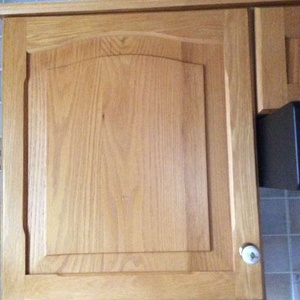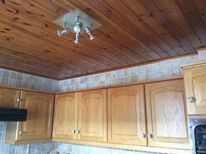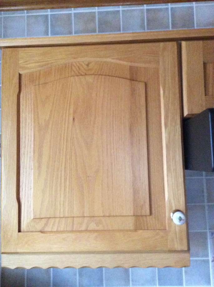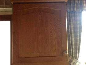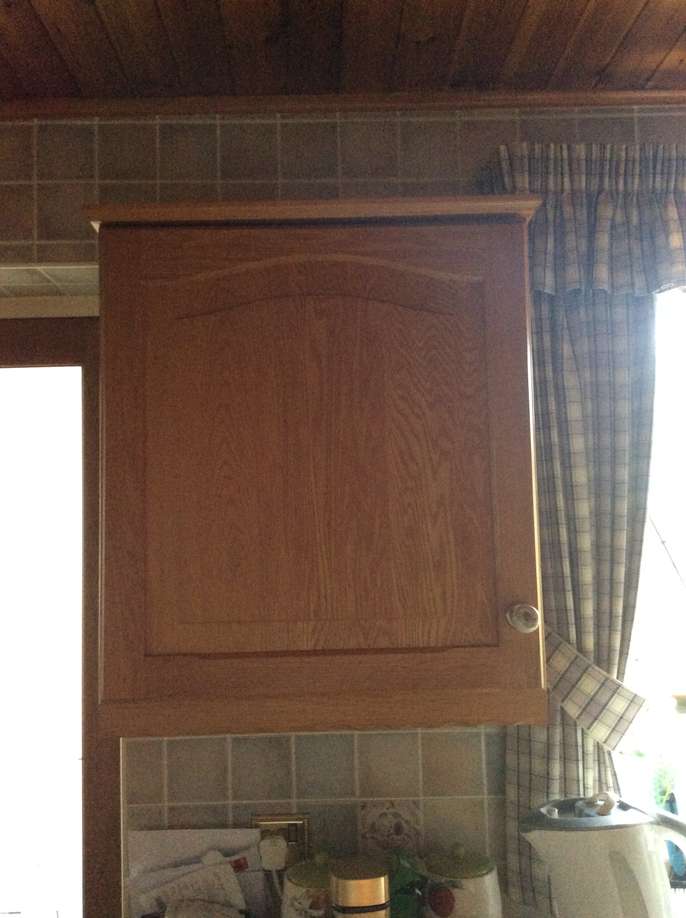Several wall cabinets - ideal for extra storage. Two doubles, one corner and two single cabinets with oak coloured doors.