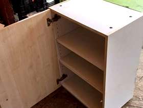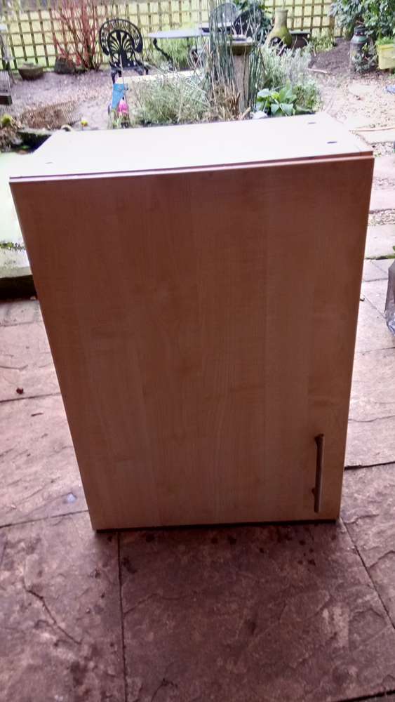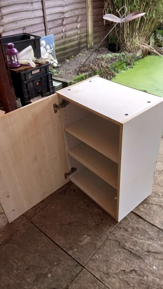 Measures 35 x 50 x 70cm. Two internal shelves Would be ok in a garage or shed? Its outside (but under a canopy) so probably needs to go sharpish. We will have more kitchen units available next week.
