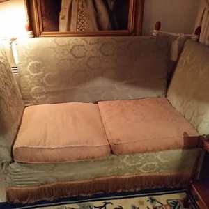 Circa 1900s. 2 seater sofa, covered with Damask light Sage green. Sides do fold down so can be used as a day bed. 4ft wide 3ft deep and 3ft high. Side fold down and then the side are 2ft wider on each side. If you have any questions please email. collection only. New sofa arriving so this one is surplus to requirements.