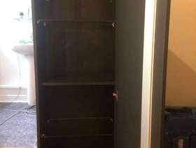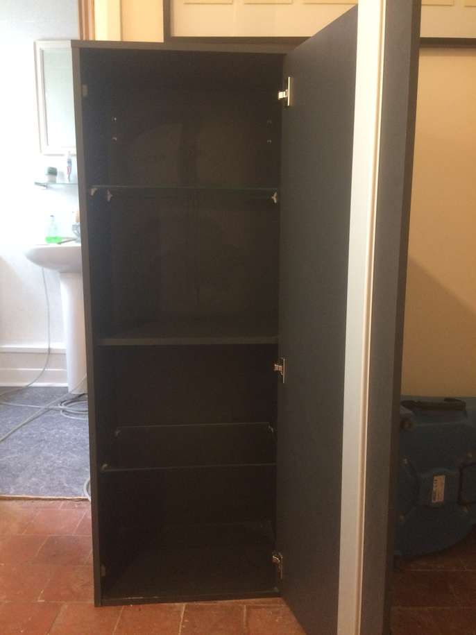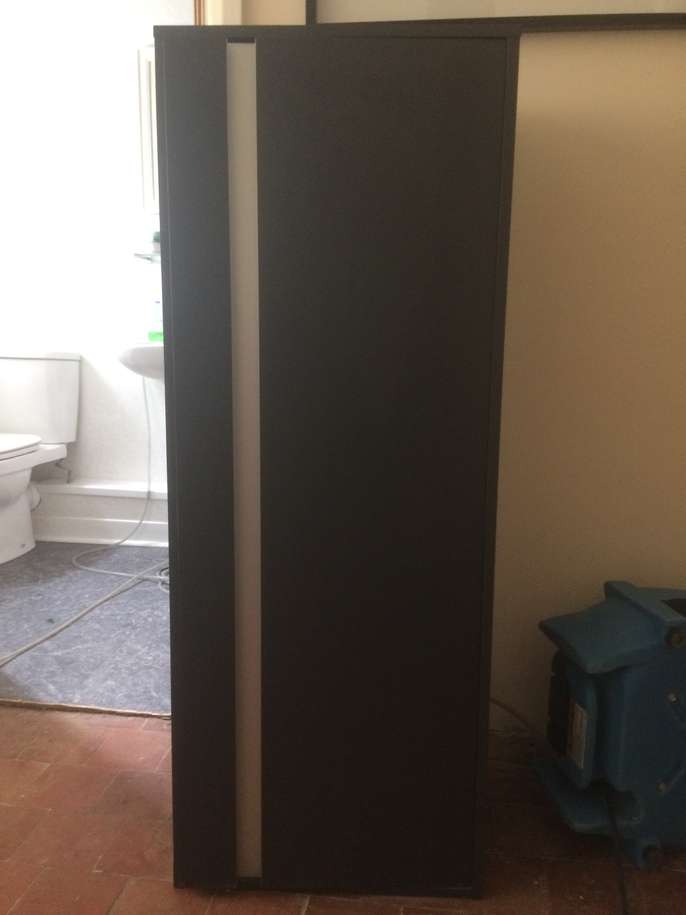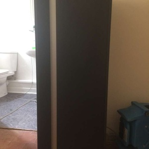 Duvalit Bathroom Cabinet in Dark Grey/Black. Dimensions height 132 cm, width 50 cm, depth 36 cm. Currently retails for £516, has a bracket attached so can be wall mounted . 3 shelves 2 glass. Water damaged at the bottom which means the door not closing fully so needs attention.