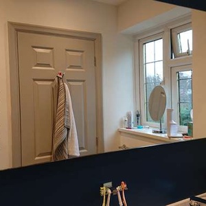 Mirror approx 2ft x 4ft (60 x125 cms) Side razor point. Heat pad for steam free use. Lights down both sides. Slight loss of reflective surface at edge