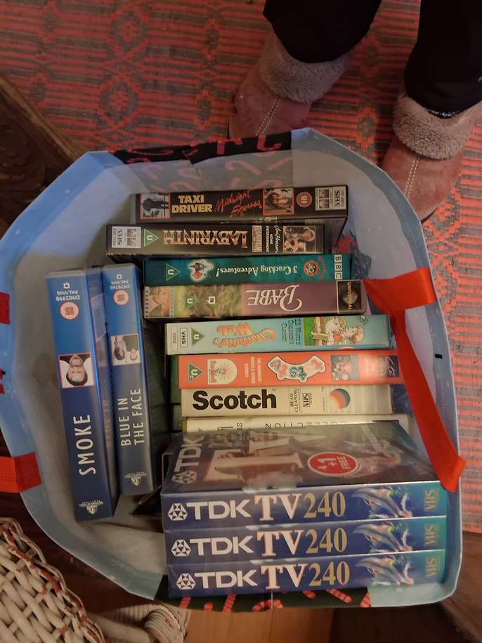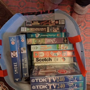 Large carrier bag of mostly VHS tapes,